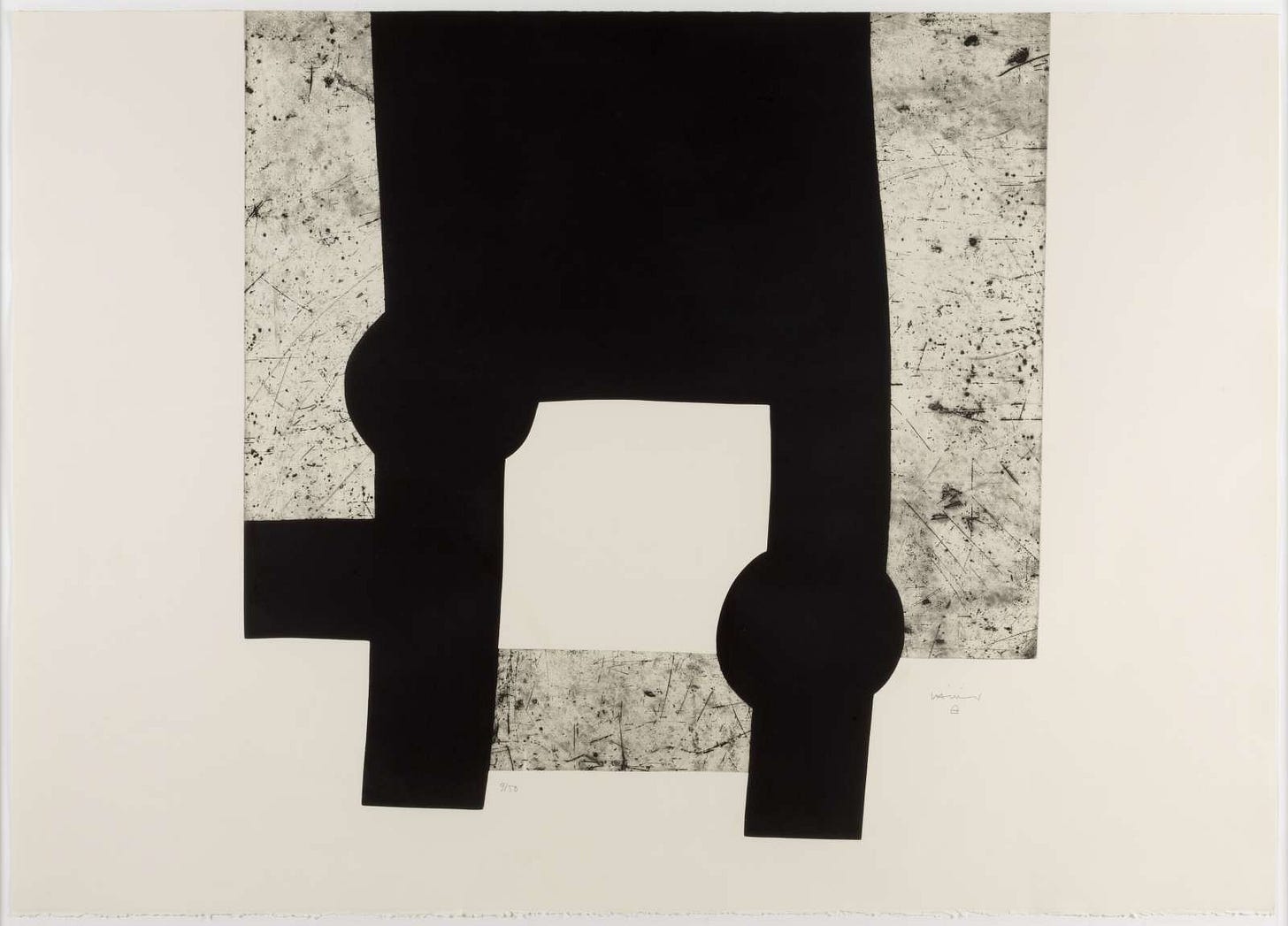In 1992, Eduardo Chillida made a print for Médecins du Monde. Doctors of the World. The French humanitarian medical network founded in 1980 that now operates in over 70 countries, providing care in conflict zones, refugee camps, and communities where health systems have collapsed. For their cause, Chillida made an etching with embossing. Black ink on white paper. A form that seems to both hold and release space at the same time.